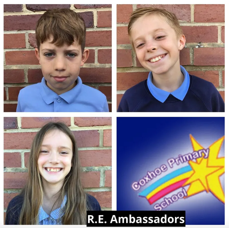 Hello! We are the R.E ambassadors and we really enjoy learning about how people live their lives and what is important to them. In Coxhoe Primary School RE is always fun. We learn in lots of different ways including drawing, drama, practical activities and visitors to help us remember key information. We also learn outside of the classroom through visits to different places of worship.